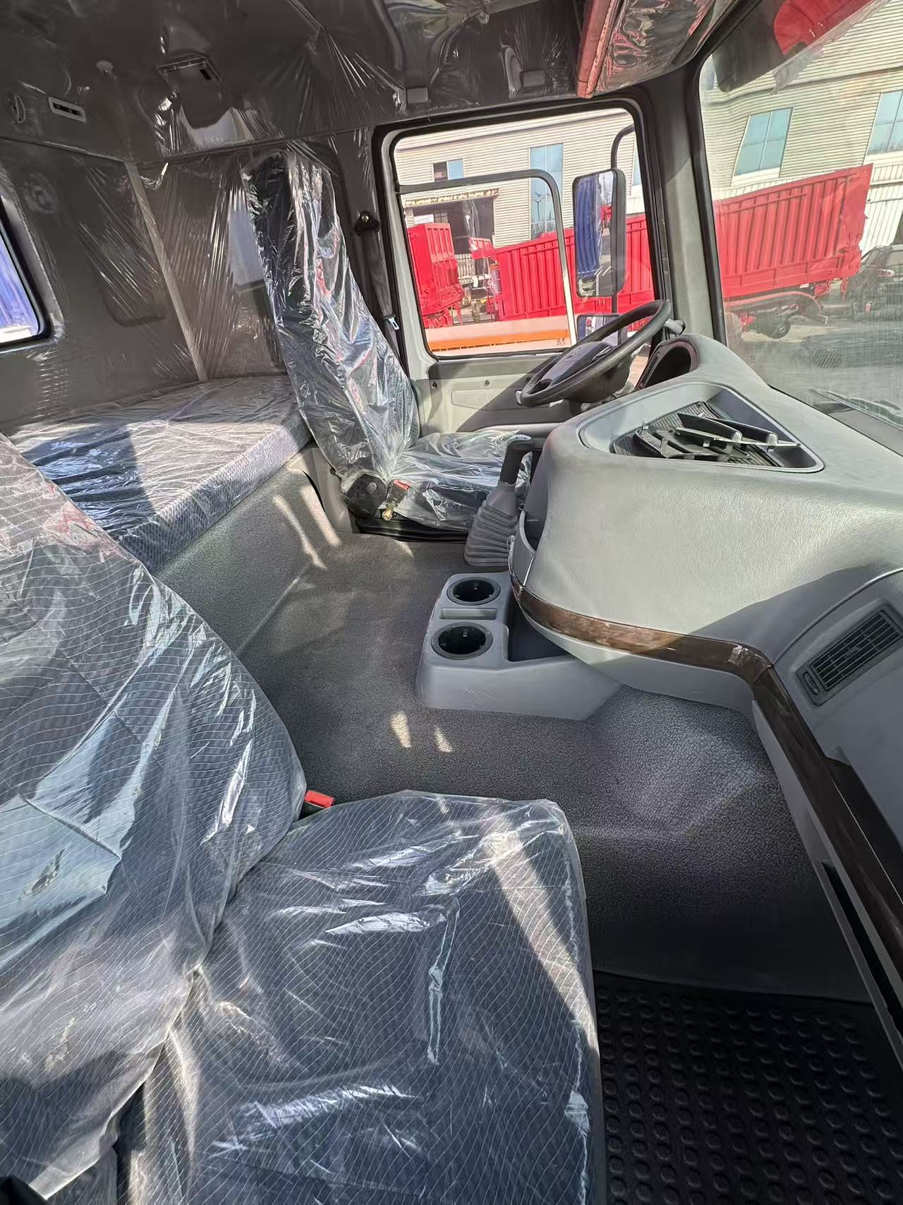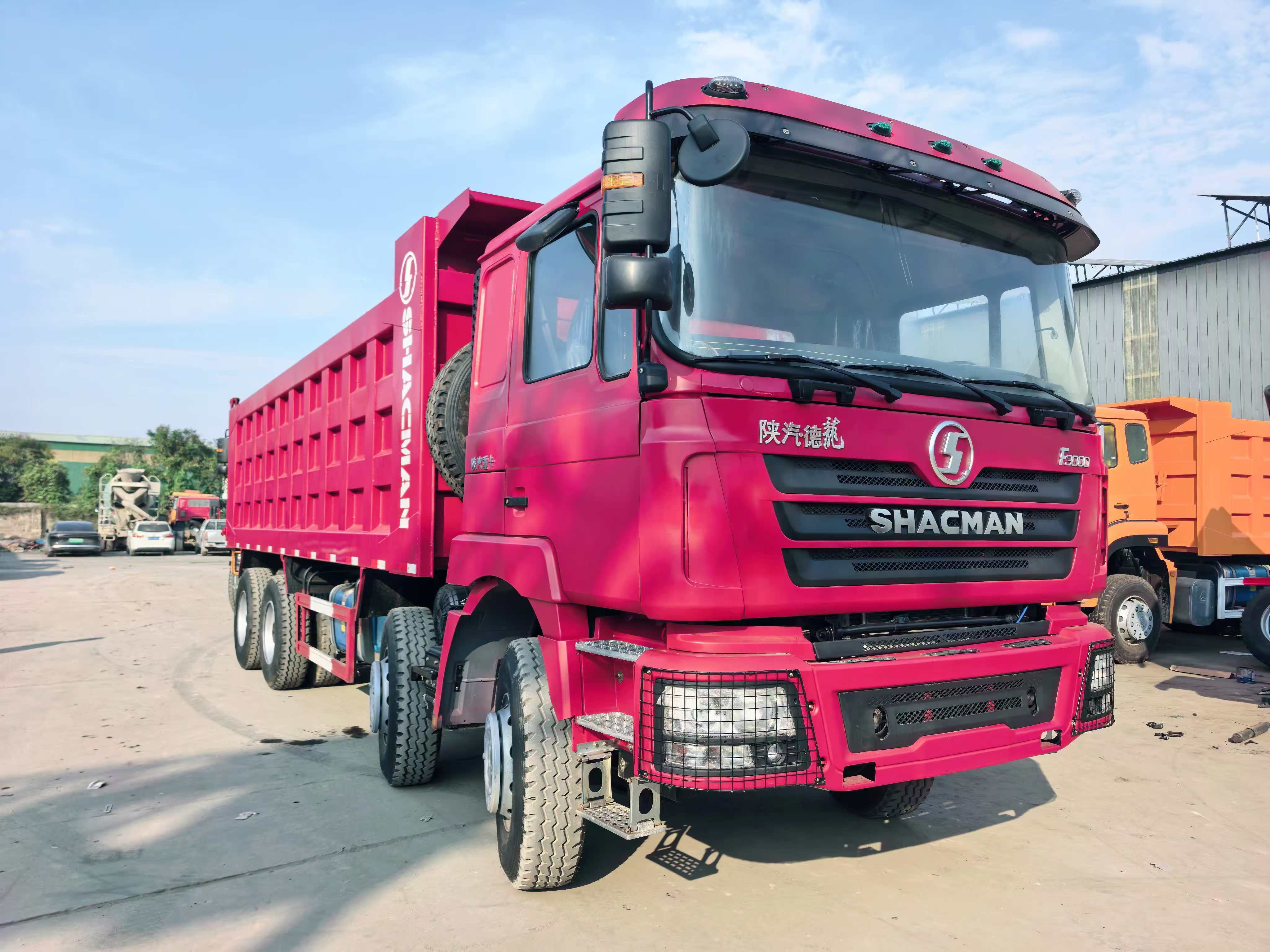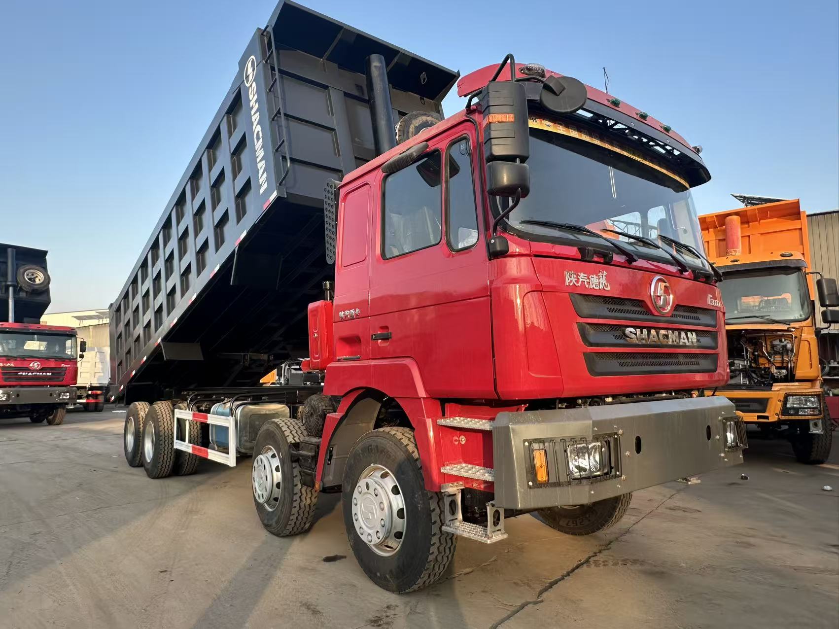 ◦ adopte le châssis du tracteur lourd Shaanxi (shacman) avec le godet de déchargement arrière, le godet est une structure de cadre en acier à haute résistance avec le logo de marque « shacman» imprimé sur le côté; Le godet de chargement est dans un état de levage, montrant la fonction de base de l'auto - déchargement hydraulique.